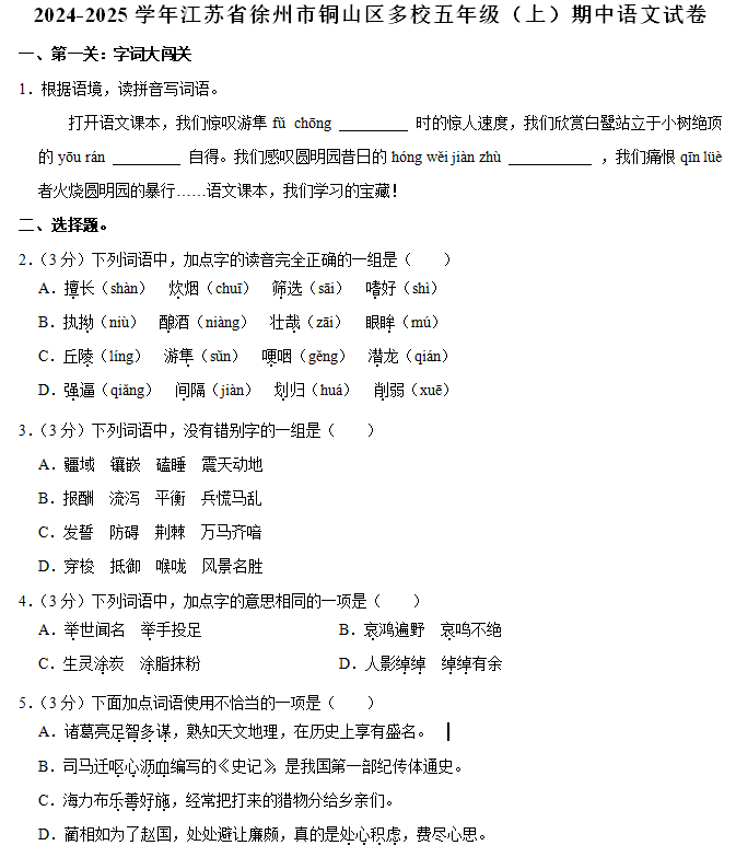 江苏100教学资源网 五上 2024-2025学年江苏省徐州市铜山区多校五年级(上)期中语文试卷(含解析) https://www.jiangsu100.com/17592.html