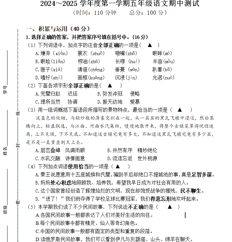 江苏100教学资源网 五上 江苏省南通市海门区东洲小学等2024-2025学年五年级上学期11月期中语文试题(含答案) https://www.jiangsu100.com/17619.html