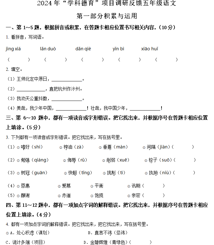 江苏100教学资源网 五上 江苏省盐城市某区2024-2025学年五年级上册期中考试语文试卷(含答案) https://www.jiangsu100.com/17631.html