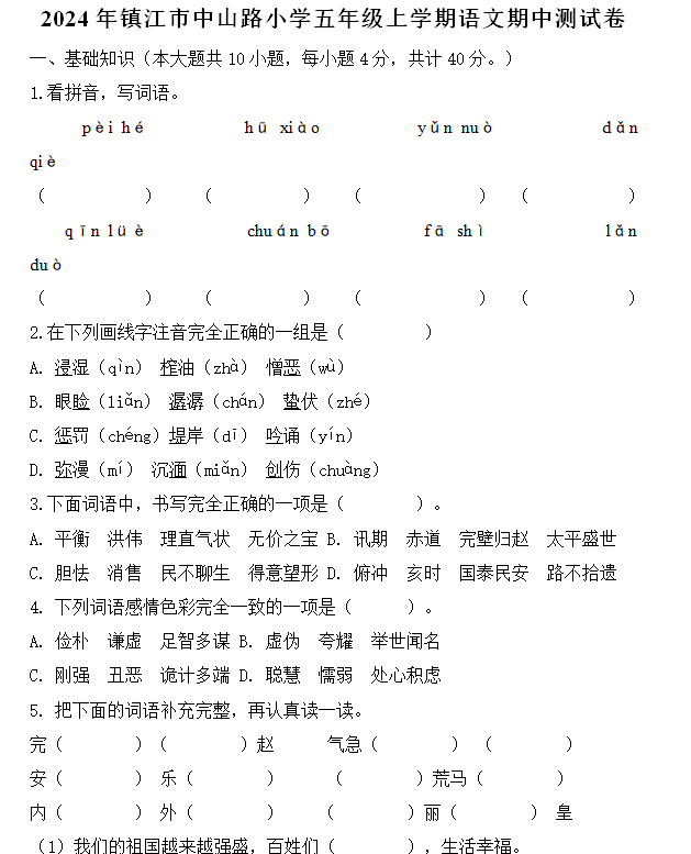江苏100教学资源网 五上 江苏省镇江市京口区中山路小学2024-2025学年五年级上学期语文期中试卷(含答案) https://www.jiangsu100.com/17634.html