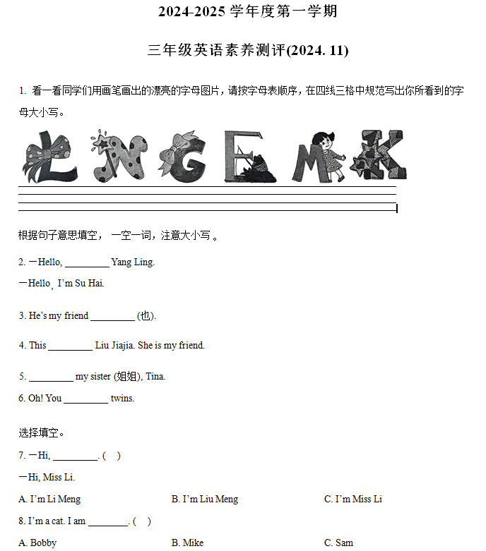 江苏100教学资源网 三上 2024-2025学年江苏省徐州市邳州市译林版(三起)(2024)三年级上册11月期中测试英语试卷(含解析) https://www.jiangsu100.com/17737.html