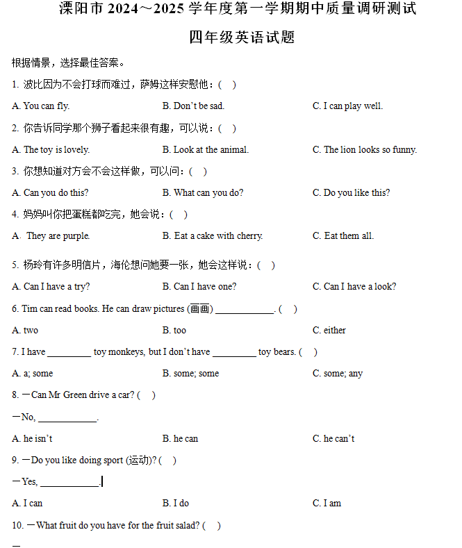 江苏100教学资源网 四上 2024-2025学年江苏省常州市溧阳市译林版(三起)四年级上册11月期中测试英语试卷(含解析) https://www.jiangsu100.com/17790.html