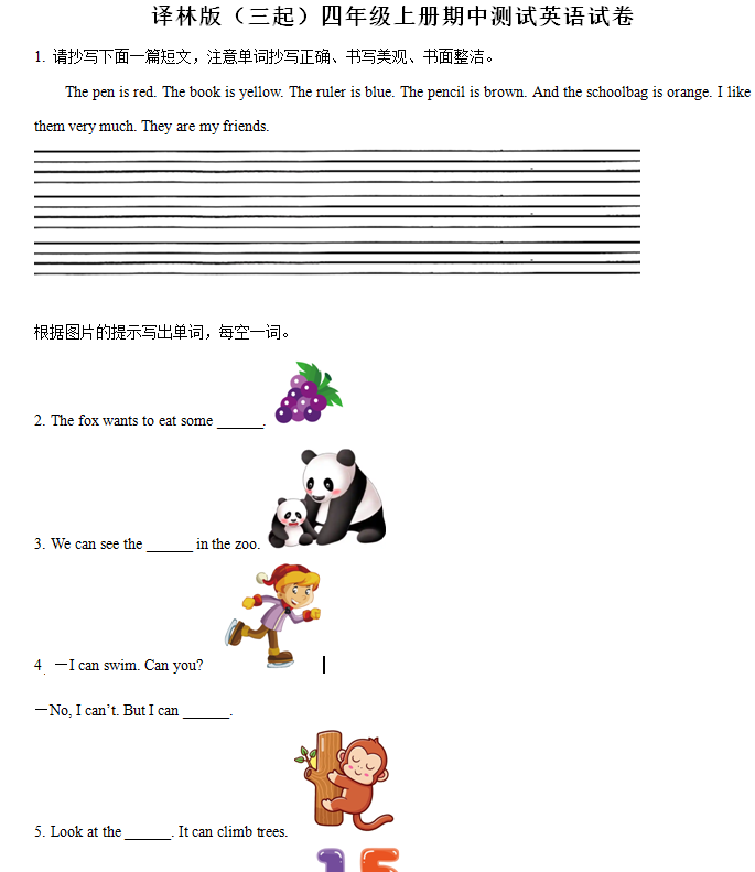 江苏100教学资源网 四上 2024-2025学年江苏省泰州市兴化市译林版(三起)四年级上册期中测试英语试卷(含解析) https://www.jiangsu100.com/17817.html