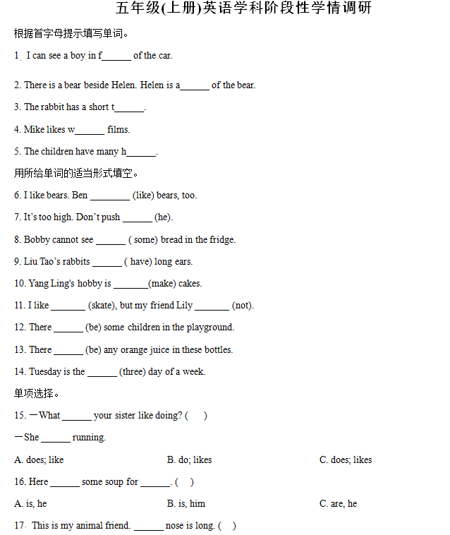 - 2024-2025学年江苏省徐州市丰县译林版(三起)五年级上册11月期中测试英语试卷(含解析) 2025-11-13