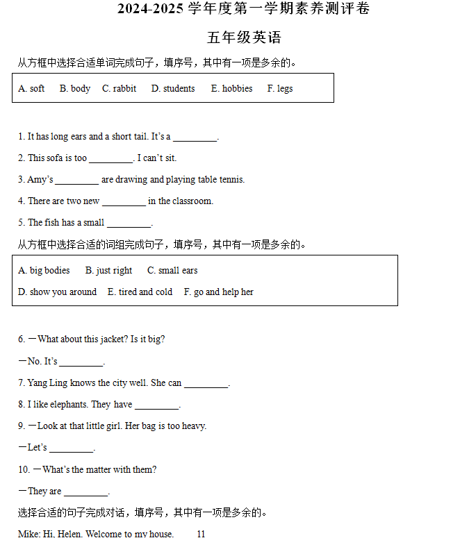- 2024-2025学年江苏省徐州市丰县译林版(三起)五年级上册11月期中测试英语试卷(含解析) 2025-11-13