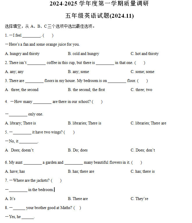 江苏100教学资源网 五上 2024-2025学年江苏省徐州市沛县新城实验学校译林版(三起)五年级上册期中测试英语试卷(含解析) https://www.jiangsu100.com/17906.html