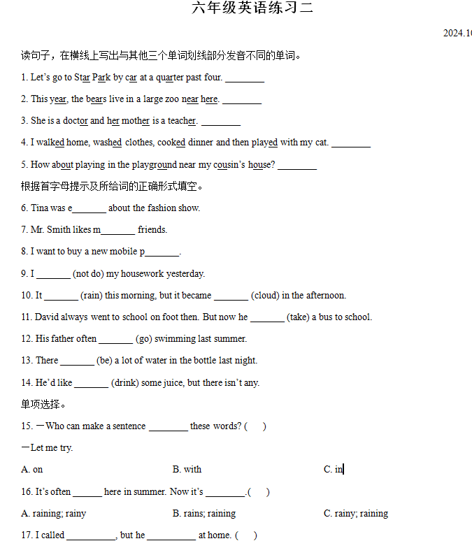 江苏100教学资源网 六上 2024-2025学年江苏省淮安市洪泽区实验小学等四校联考译林版(三起)六年级上册11月期中测试英语试卷(含解析) https://www.jiangsu100.com/17954.html