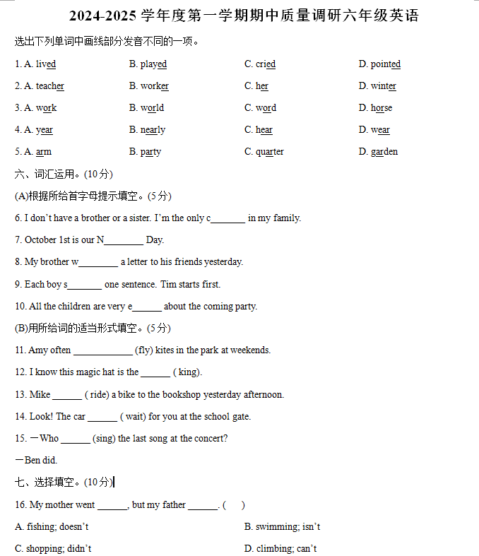- 2024-2025学年江苏省徐州市邳州市译林版(三起)六年级上册11月期中测试英语试卷(含解析) 2025-11-14