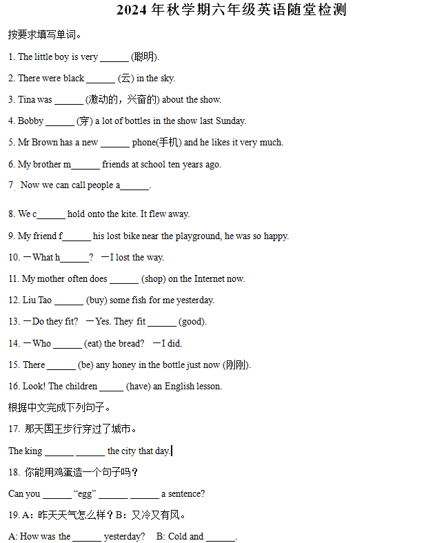 江苏100教学资源网 六上 2024-2025学年江苏省盐城市射阳县译林版(三起)(2012)六年级上学期阶段随堂训练英语试卷(含解析) https://www.jiangsu100.com/18003.html