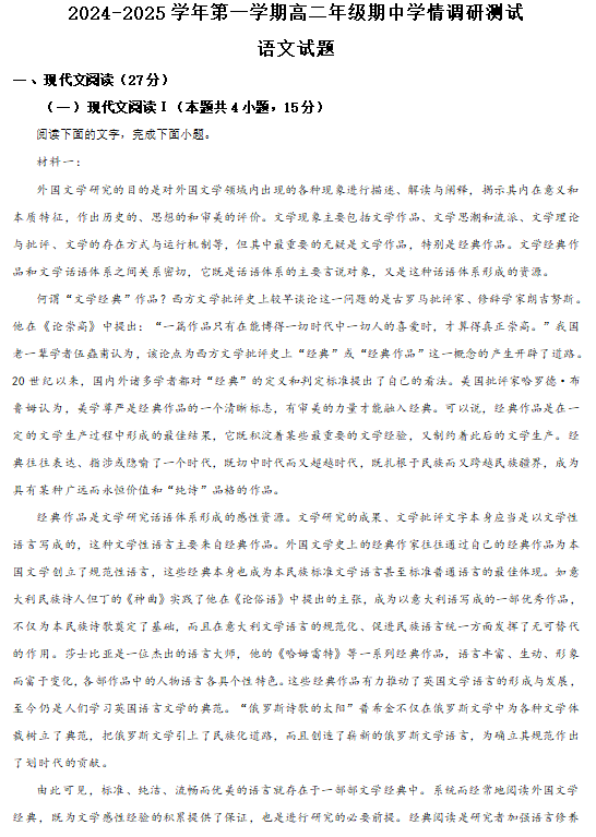 江苏100教学资源网 高二上 江苏省扬州市高邮市2024-2025学年高二上学期11月期中考试语文试题(含解析) https://www.jiangsu100.com/18390.html
