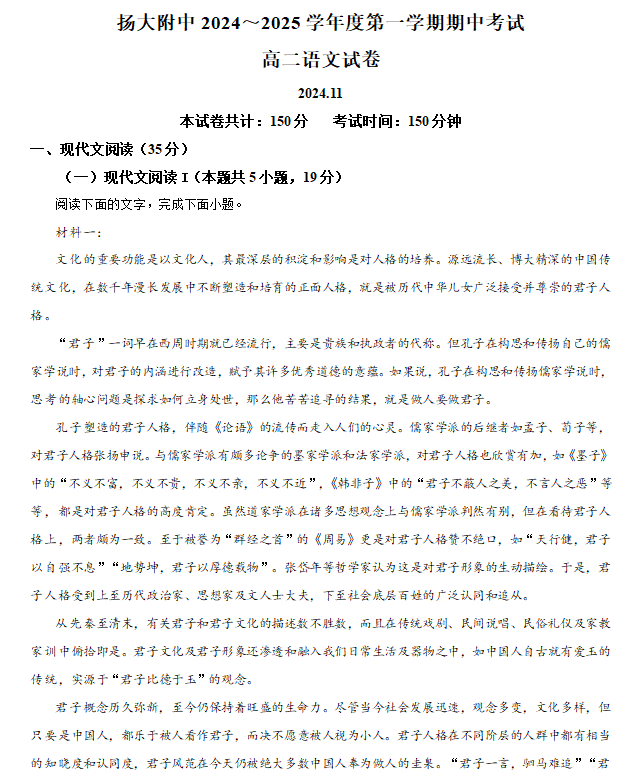 江苏100教学资源网 高二上 江苏省扬州市广陵区扬州大学附属中学2024-2025学年高二上学期11月期中考试语文试题(含解析) https://www.jiangsu100.com/18393.html
