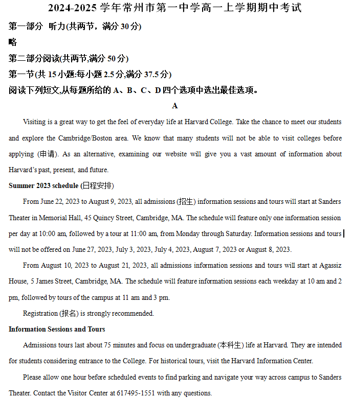 江苏100教学资源网 高一上 江苏省常州市第一中学2024-2025学年高一上学期期中考试英语试题(含解析) https://www.jiangsu100.com/18421.html