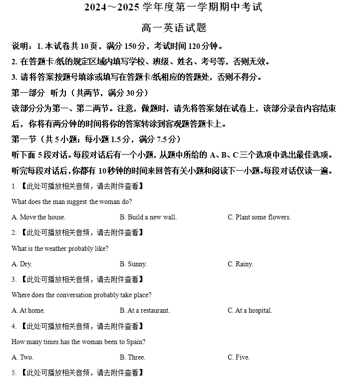 江苏100教学资源网 高一上 江苏省连云港市东海县2024-2025学年高一上学期期中考试英语试题(含解析+听力音频) https://www.jiangsu100.com/18430.html