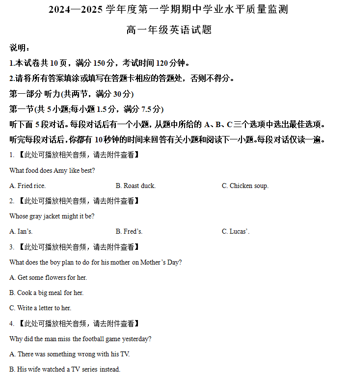 江苏100教学资源网 高一上 江苏省连云港市赣榆区2024-2025学年高一上学期11月期中英语试题(含解析+听力音频) https://www.jiangsu100.com/18433.html