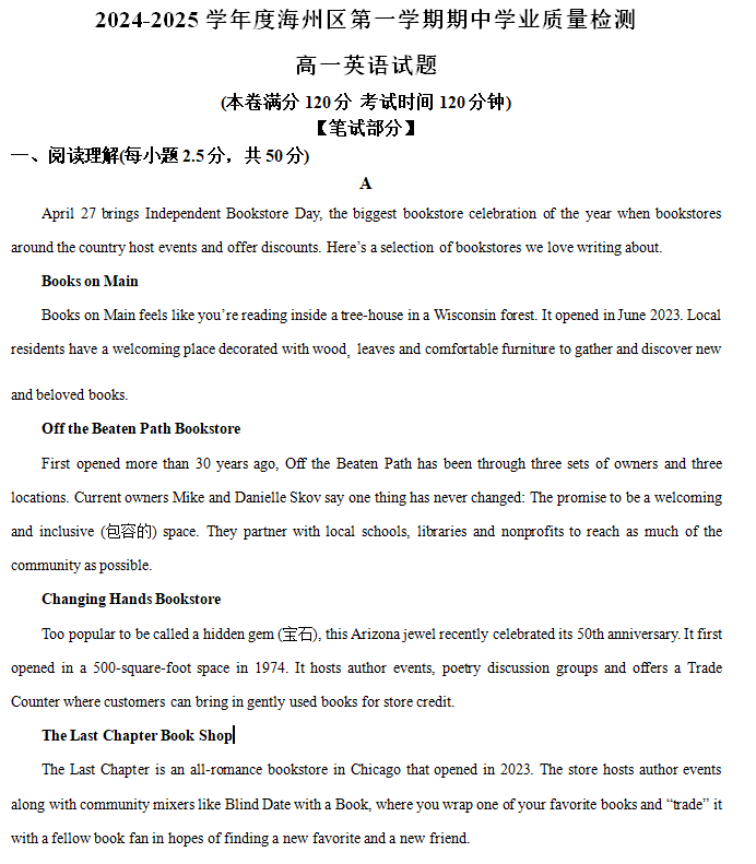 江苏100教学资源网 高一上 江苏省连云港市海州区2024-2025学年高一上学期11月期中英语试题(含解析) https://www.jiangsu100.com/18442.html