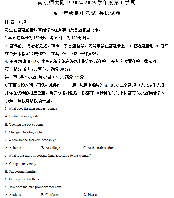 江苏100教学资源网 高一上 江苏省南京市南京师范大学附属中学2024~2025学年高一上学期期中考试英语试卷(含解析) https://www.jiangsu100.com/18448.html