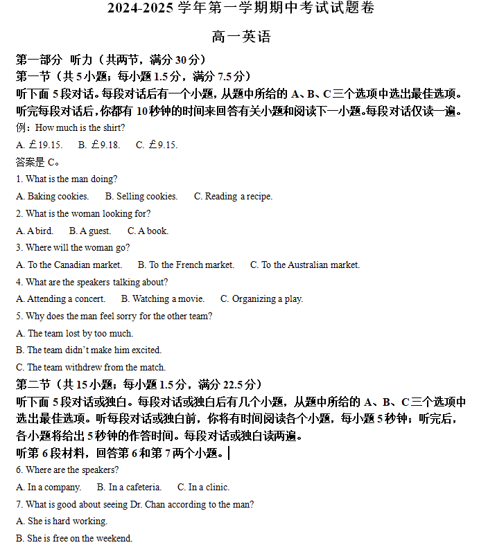 江苏100教学资源网 高一上 江苏省苏州工业园区星海实验高级中学2024-2025学年高一上学期期中英语试卷(含解析) https://www.jiangsu100.com/18472.html