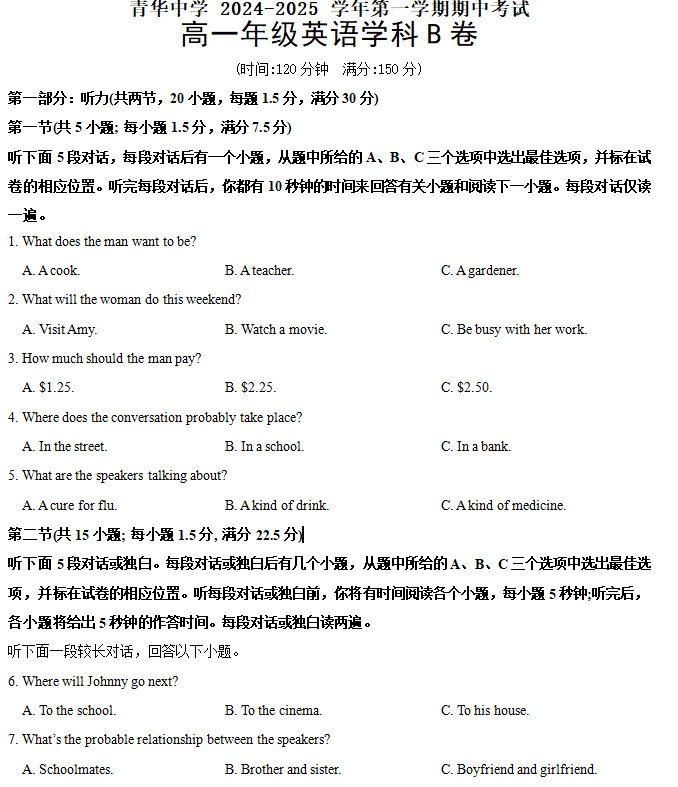 江苏100教学资源网 高一上 江苏省宿迁青华中学2024-2025学年高一上学期期中考试英语试卷B卷(含答案+听力音频) https://www.jiangsu100.com/18481.html