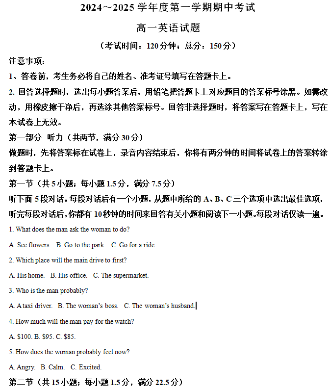 江苏100教学资源网 高一上 江苏省泰州市泰兴市兴化市两市联考2024-2025学年高一上学期期中英语试题(含解析) https://www.jiangsu100.com/18490.html