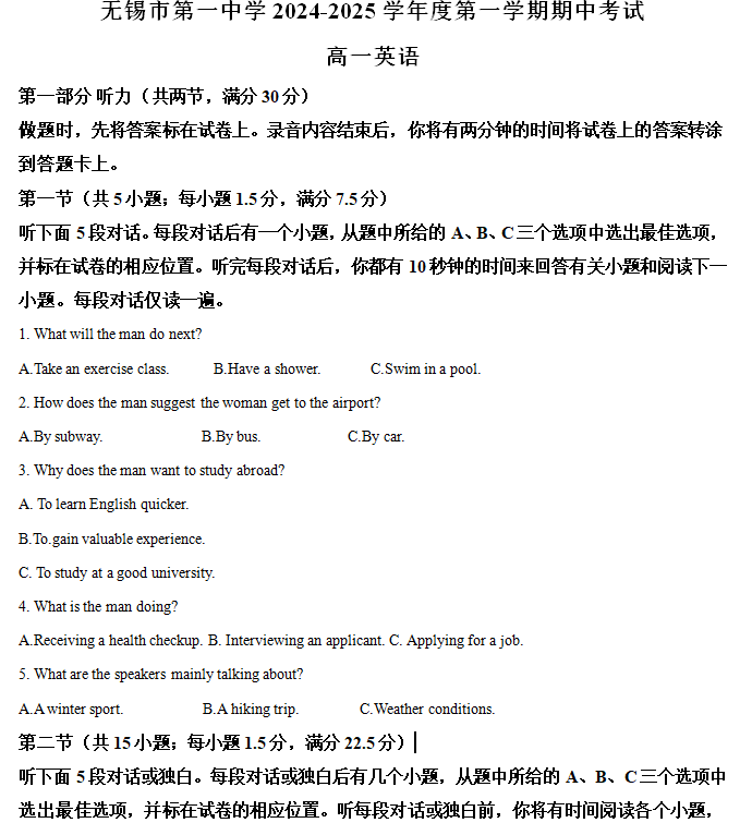江苏100教学资源网 高一上 江苏省无锡市第一中学2024-2025学年高一上学期11月期中英语试题(含解析) https://www.jiangsu100.com/18496.html