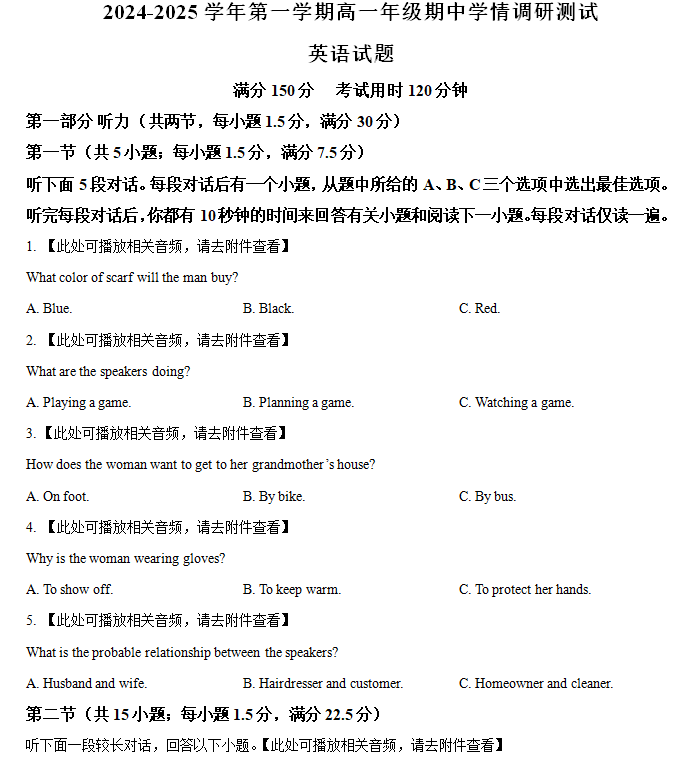 江苏100教学资源网 高一上 江苏省扬州市高邮市2024-2025学年高一上学期11月期中英语试题(含解析+听力音频) https://www.jiangsu100.com/18532.html