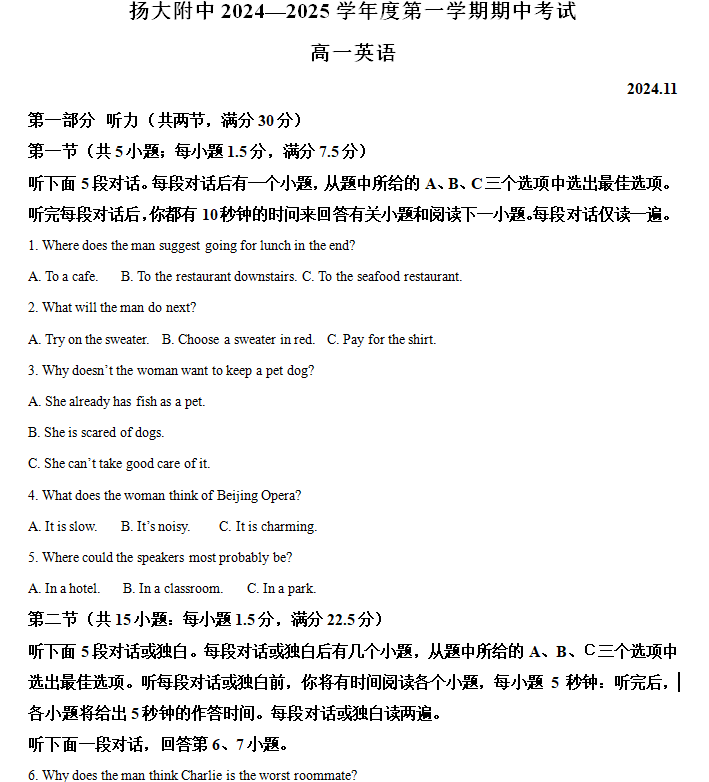 江苏100教学资源网 高一上 江苏省扬州市广陵区扬州大学附属中学2024-2025学年高一上学期11月期中英语试题(含解析) https://www.jiangsu100.com/18539.html