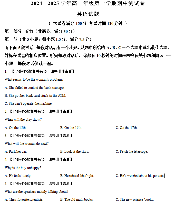 江苏100教学资源网 高一上 江苏省扬州市邗江区2024-2025学年高一上学期期中英语试题(含解析+听力音频) https://www.jiangsu100.com/18542.html