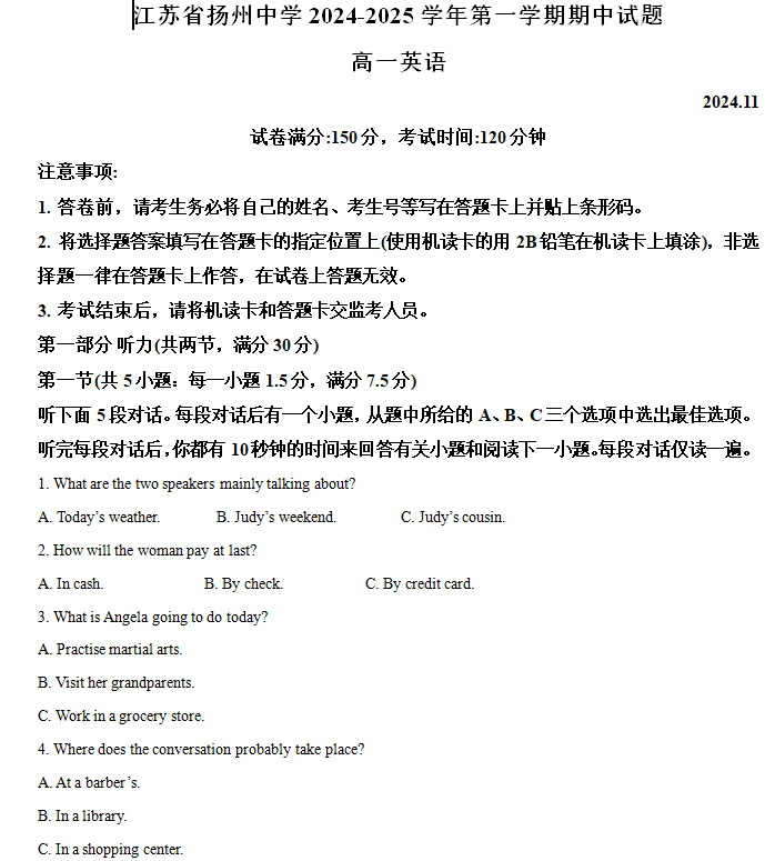 江苏100教学资源网 高一上 江苏省扬州中学2024-2025学年高一上学期11月期中英语试题(含解析) https://www.jiangsu100.com/18551.html