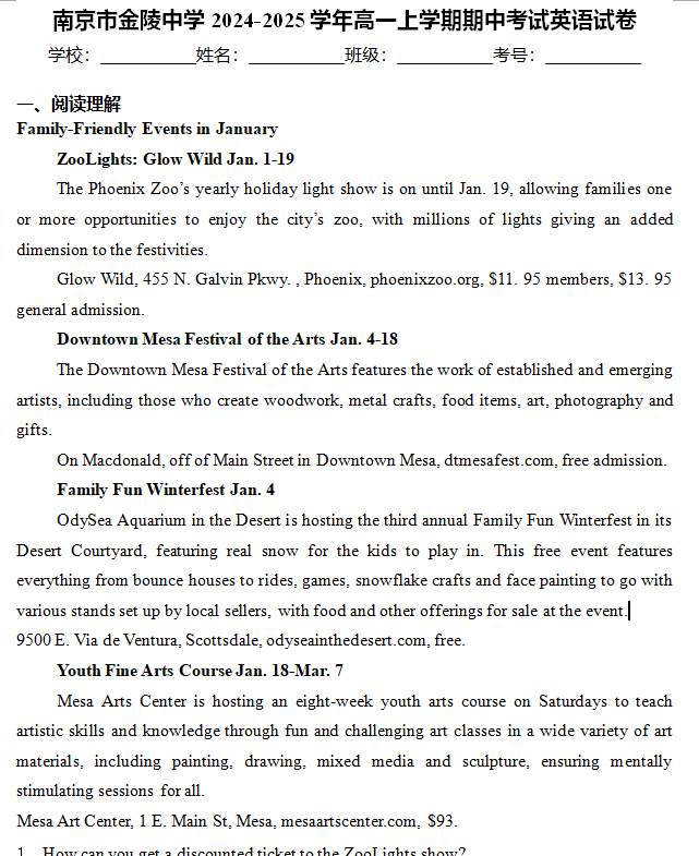 江苏100教学资源网 高一上 江苏省南京市金陵中学2024-2025学年高一上学期期中考试英语试卷(含答案) https://www.jiangsu100.com/18563.html
