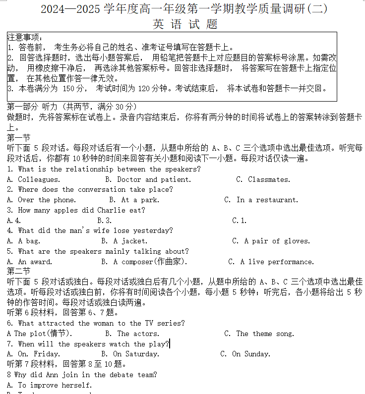 江苏100教学资源网 高一上 江苏省南通市如皋十校2024-2025学年高一上学期11月期中英语试题(含答案) https://www.jiangsu100.com/18566.html