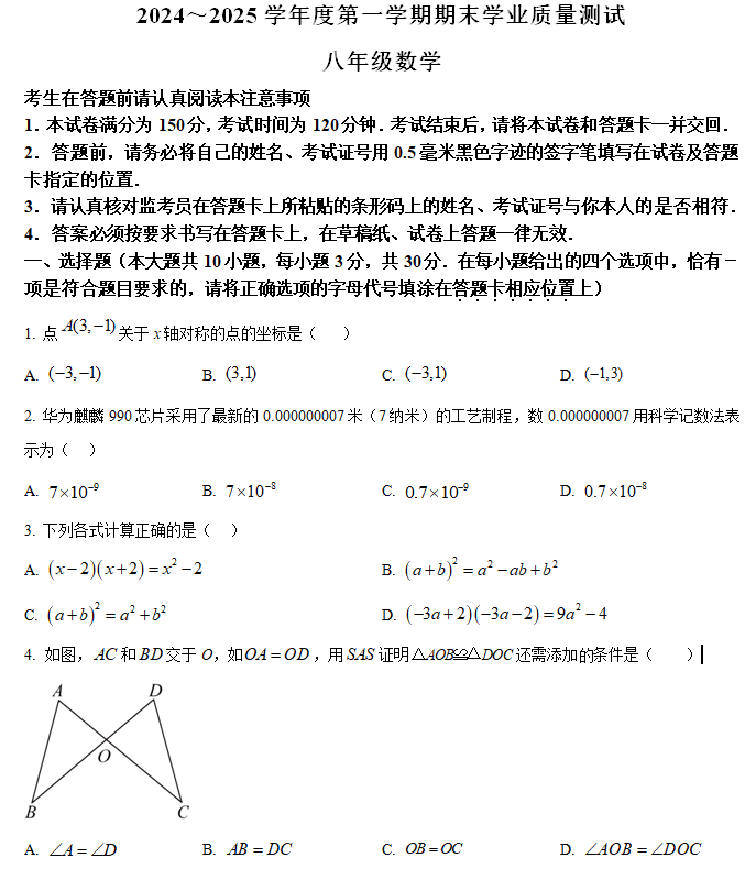 江苏100教学资源网 八上 江苏省南通市海安市2024-2025学年八年级上学期1月期末考试数学试题(含解析) https://www.jiangsu100.com/19184.html