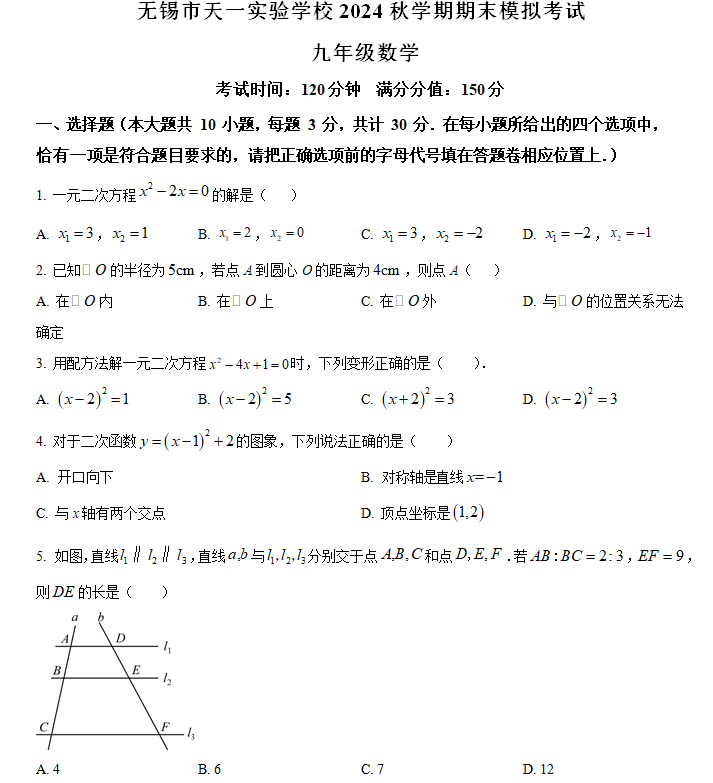 江苏100教学资源网 九上 江苏省无锡市天一实验学校2024-2025学年上学期期末九年级数学模拟试题(含解析) https://www.jiangsu100.com/19460.html