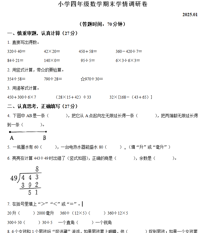 江苏100教学资源网 四上 2024-2025学年江苏省南京市六合区苏教版四年级上册期末考试数学试卷(含解析) https://www.jiangsu100.com/19925.html