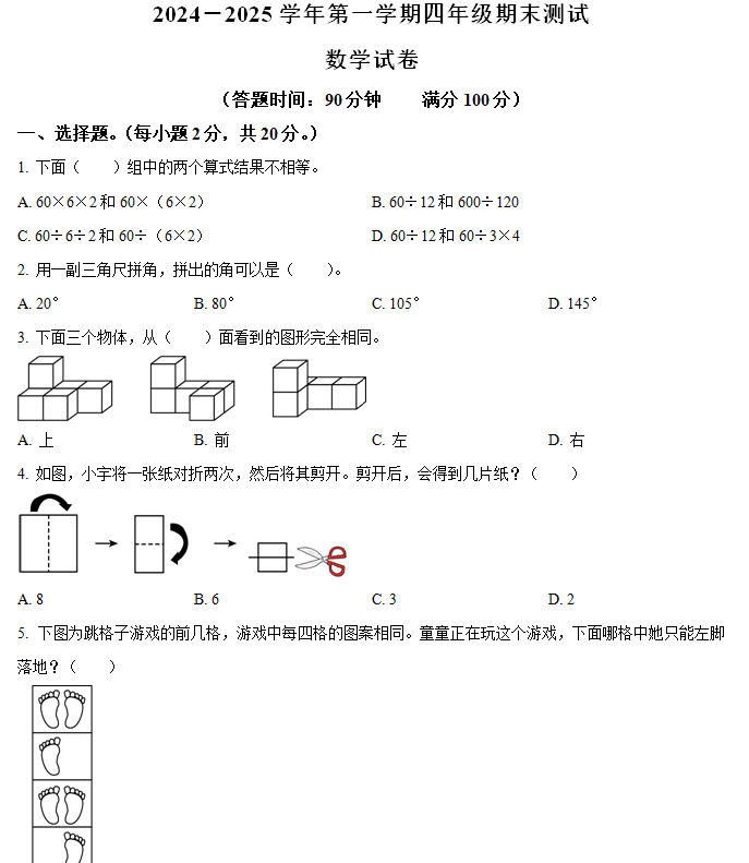 江苏100教学资源网 四上 2024-2025学年江苏省南通市崇川区苏教版四年级上册期末考试数学试卷(含解析) https://www.jiangsu100.com/19931.html