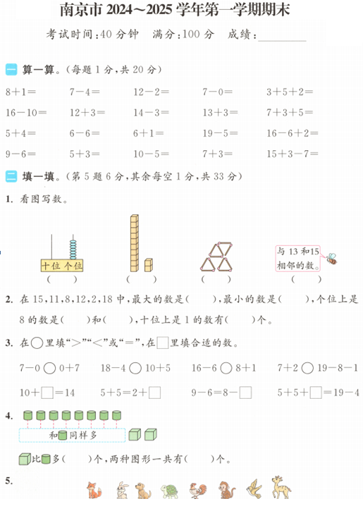 江苏100教学资源网 一上 江苏省南京市2024-2025学年一年级上学期期末数学试题(含答案) https://www.jiangsu100.com/20181.html
