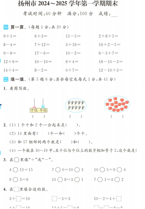 江苏100教学资源网 一上 江苏省扬州市2024-2025学年一年级上学期期末数学试题(含答案) https://www.jiangsu100.com/20205.html