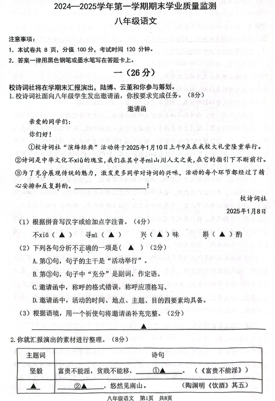 江苏100教学资源网 八上 江苏省南京市建邺区2024-2025学年八年级上学期期末考试语文试题(含答案) https://www.jiangsu100.com/21014.html