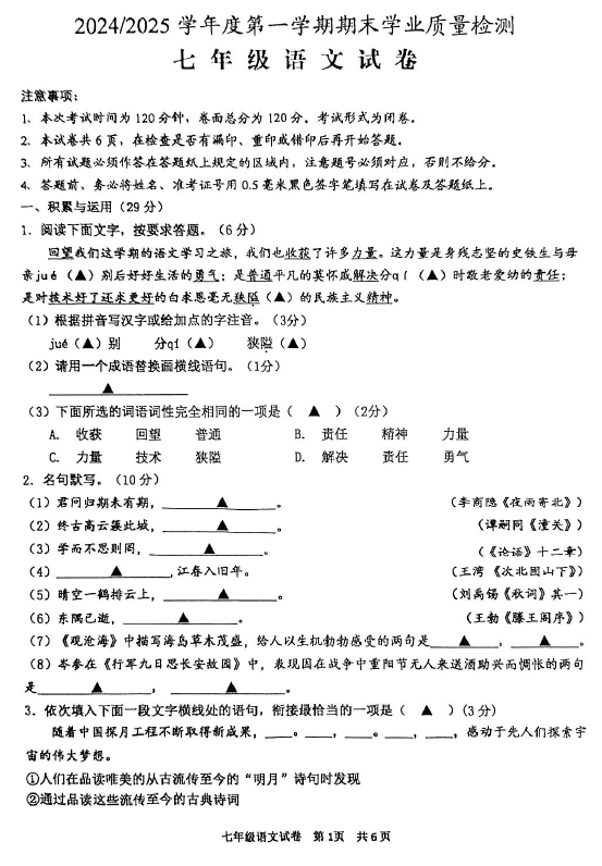 江苏100教学资源网 七上 江苏省盐城市盐都区联盟校2024-2025学年七年级上学期1月期末语文试题(含答案) https://www.jiangsu100.com/21237.html