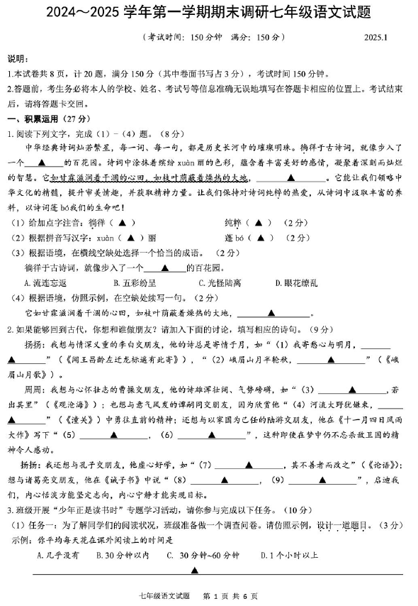 江苏100教学资源网 七上 江苏省扬州市广陵区2024-2025学年七年级上学期期末考试语文试题(含答案) https://www.jiangsu100.com/21246.html