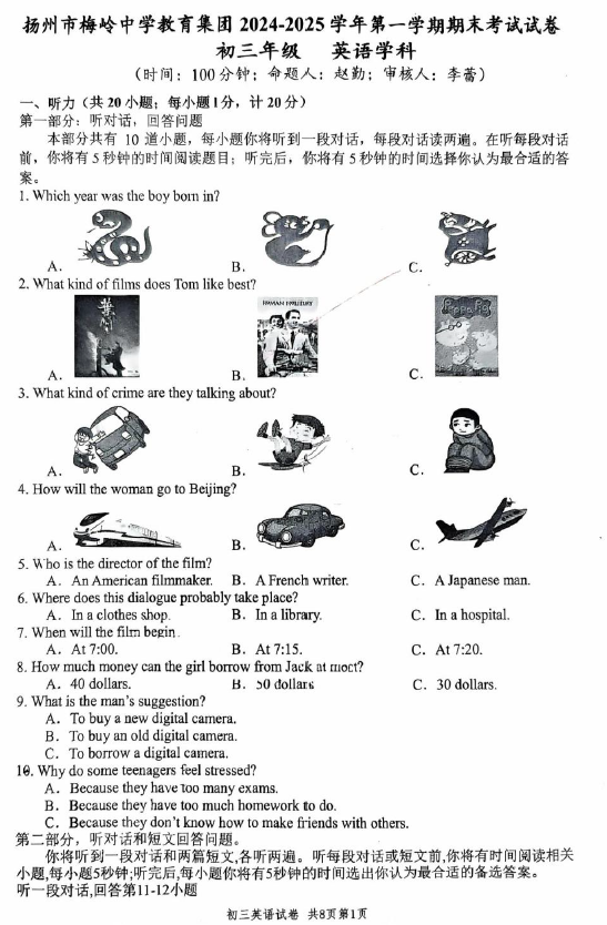江苏100教学资源网 九上 江苏省扬州市梅岭教育集团2024-2025学年九年级上学期1月期末英语试题(含答案) https://www.jiangsu100.com/21486.html