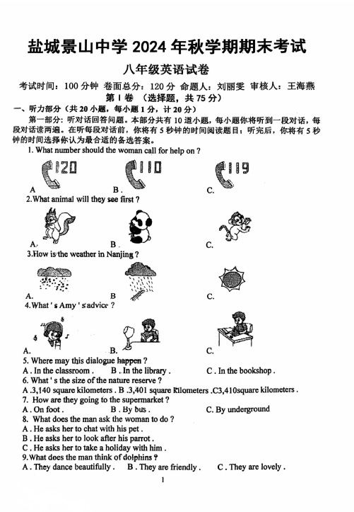 江苏100教学资源网 八上 江苏省盐城景山中学2024-2025学年八年级上学期期末英语考试试卷(含答案) https://www.jiangsu100.com/21511.html
