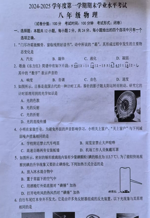 江苏100教学资源网 八上 江苏省盐城市东台市2024-2025学年八年级上学期1月期末物理试题(含答案) https://www.jiangsu100.com/22098.html