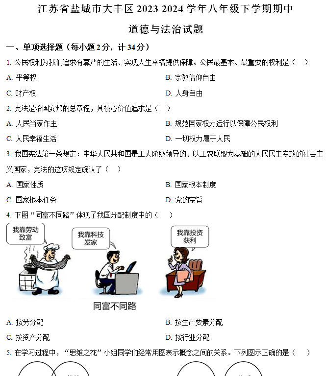 江苏100教学资源网 八下 江苏省盐城市大丰区2023-2024学年八年级下学期期中道德与法治试题(含解析) https://www.jiangsu100.com/2435.html