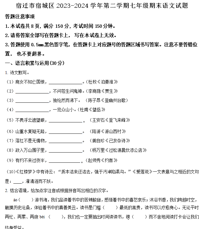 江苏100教学资源网 七下 宿迁市宿城区2023-2024学年第二学期七年级期末语文试题(含解析) https://www.jiangsu100.com/2753.html