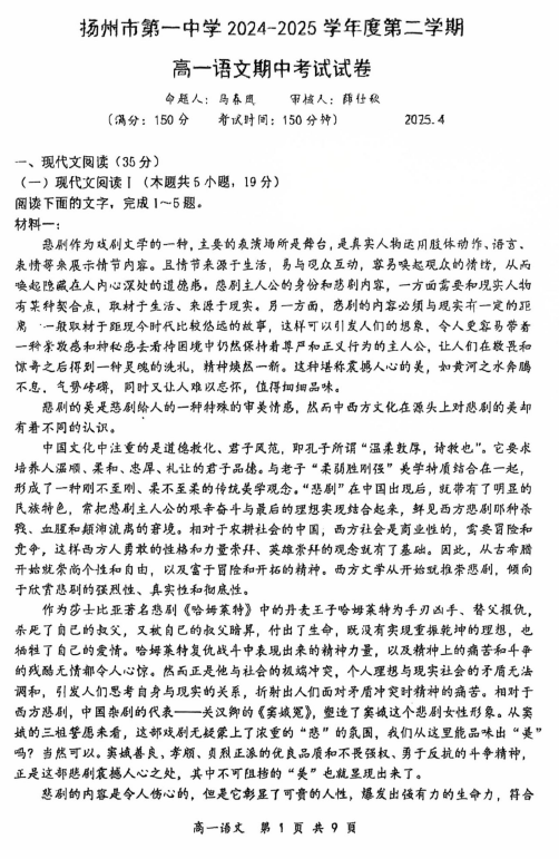 江苏100教学资源网 高一下 江苏省扬州市第一中学2024-2025学年高一下学期4月期中考试语文试题(含答案) https://www.jiangsu100.com/29850.html
