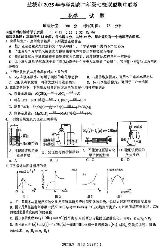 江苏100教学资源网 高二下 江苏省盐城市七校2024-2025学年高二下学期4月期中化学试题(无答案) https://www.jiangsu100.com/30619.html