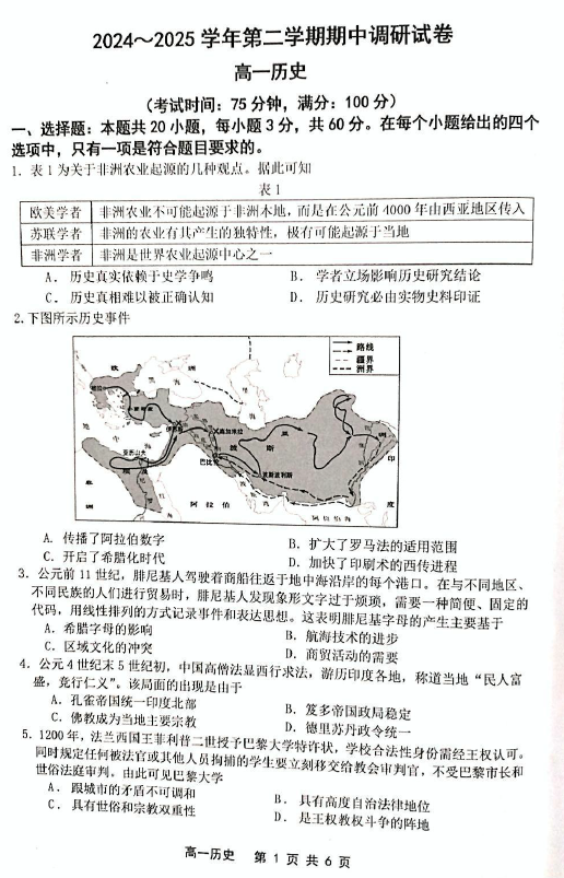 江苏100教学资源网 高一下 江苏省宿迁市泗阳县2024-2025学年高一下学期期中考试历史试题(含答案) https://www.jiangsu100.com/30894.html