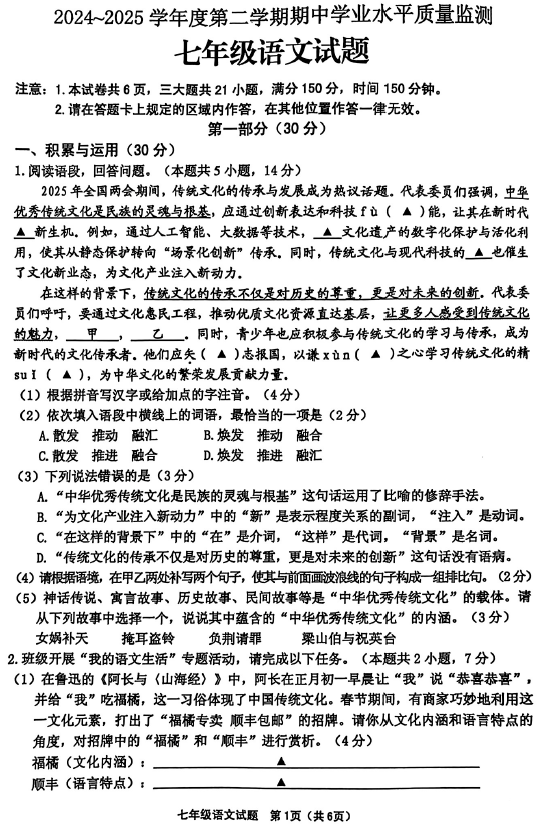- 江苏省南通市2024-2025学年七年级下学期4月期中语文试卷(无答案) 2026-04-17