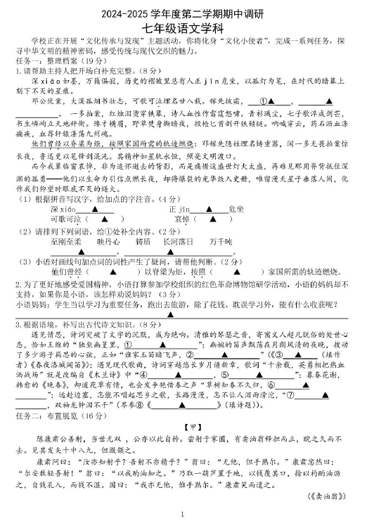 江苏100教学资源网 七下 江苏省南京市金陵河西中学2024-2025学年七年级下学期期中语文调研卷(无答案) https://www.jiangsu100.com/31845.html