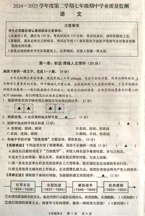 江苏100教学资源网 七下 江苏省南通市如皋市2024-2025学年七年级下学期4月期中语文试题(含答案) https://www.jiangsu100.com/31865.html
